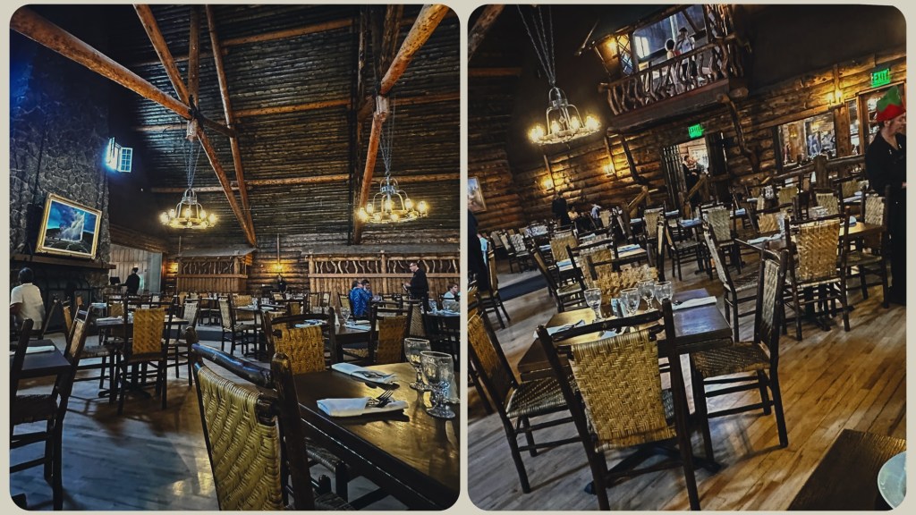 Old Faithful’s Lodge is the world’s biggest log house. Diner Buffet in Old Faithful’s Inn – was the reservation (actually early diner at 4.30pm – the only slot available beside everything after 9pm)