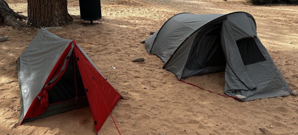 First time setting up the tent during the trip. All easy. But the recommendation to have Bear Spray with you (in the tent) is a really expensive one.